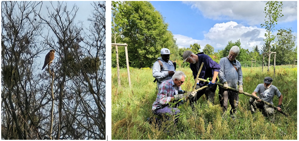 Zum 10jährigen Jubiläum konnten wir ja dank großzügiger Sponsoren in der Mitte des Geländes einen Baumkreis aus 10 größeren Bäumen pflanzen. Kurze Zeit später kamen weitere 13 bereits mehrjährige Platanen hinzu. Nachdem diese Bäume am Wegrand eingesetzt waren, dauerte es nicht lange, bis sich ein Falke auf einem der Jungbäume niederließ, uns bei der Arbeit beobachtete und uns auf eine Idee brachte…