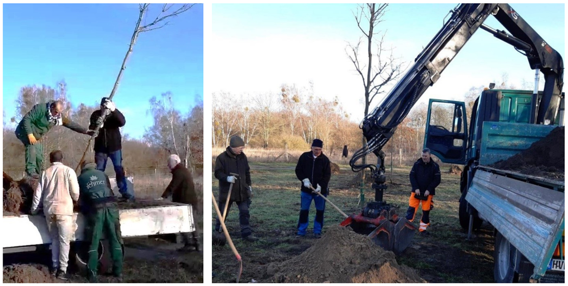 Da es sich um 5 bis 6 Meter hohe Bäume mit großen Wurzelballen handelt, war die Pflanzung für uns eine echte Herausforderung, besonders, weil wir nicht viel Zeit für die Vorbereitungen hatten. Schnell mussten wir uns einen Plan für die Aktion überlegen, die Baumposition einmessen und Hilfe organisieren. Zum Glück haben uns das Grünflächenamt und der Betriebshof der Stadt Falkensee mit Technik und Material tatkräftig unterstützt.