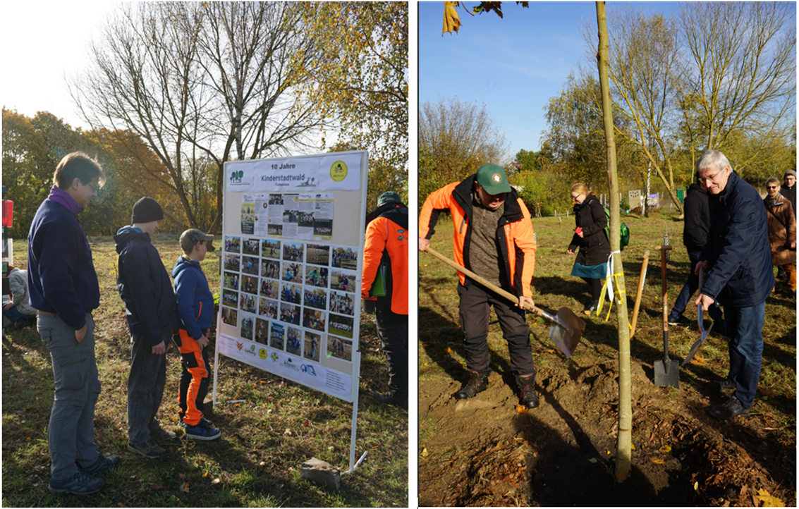 Bei schönstem Herbstwetter mit strahlendem Sonnenschein feierten wir zusammen mit ca. 30 Gästen das 10jährige Jubiläum des Kinderstadtwaldes in Falkensee. Er wurde als Abschlussaktion der „Baumakademie“ der Organisation „Plant for the Planet“ auf einem brachliegenden Gelände in der Nähe des neuen Hallenbades angelegt.