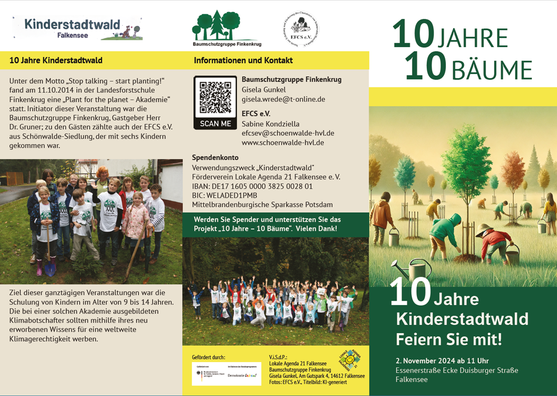 Nun, nach zehn Jahren ständiger Pflege des Kinderstadtwaldes und regelmäßigen Nachpflanzungen wollen wir das Ereignis feiern unter dem Motto “10 Jahre – 10 Bäume“. Die Feier findet am Samstag, 2. November 2024 ab 11:00 Uhr am Kinderstadtwald in der Essener Ecke Duisburger Straße in Falkensee statt und alle sind herzlich eingeladen! Für einen kleinen Imbiss ist gesorgt.